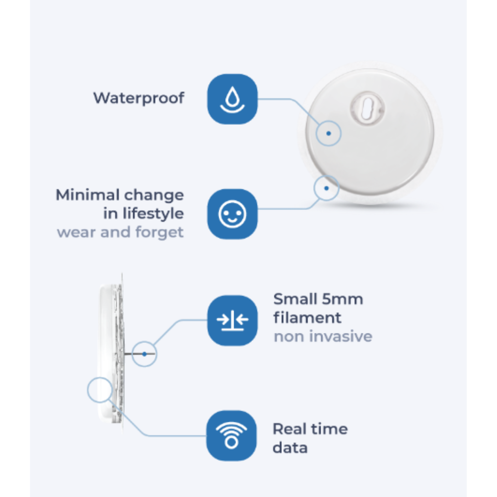 The Boi-sensor a CGM (Continuous Glucose Monitor). It's small and sticks to the back of your arm or Abdomen to read your blood glucose levels in real-time.
